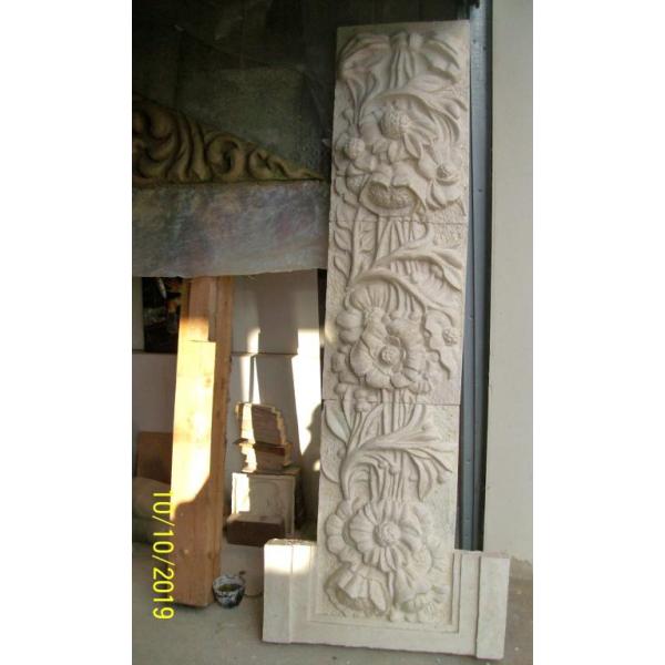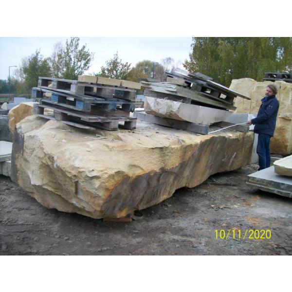 Der über 4 m lange Block aus Warthauer Sandstein ist der Rohling für die Nachbildung der rechten Portalsäule (Stein Nr. 73). Dieser mächtige Steinblock wird demnächst in der Werkstatt der Schubert Steinmetz und Steinbildhauer GmbH bearbeitet. Firmeninhaber Sven Schubert (im Bild zum Größenvergleich) stammt aus Halle-Ammendorf.
