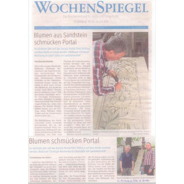 Kürzlich hatte Bildhauer Christoph Reichenbach den Portalstein Nr. 13, das großflächige Sandsteinrelief zwischen den Fenstern des Barockflügel-Portals des Alten Rathauses, an den Auftraggeber - die Stiftung Altes Rathaus Halle (Saale) - übergeben. Die meisten lokalen Medien der Händelstadt berichteten recht ausführlich darüber. Nachfolgend Links zu Medien: