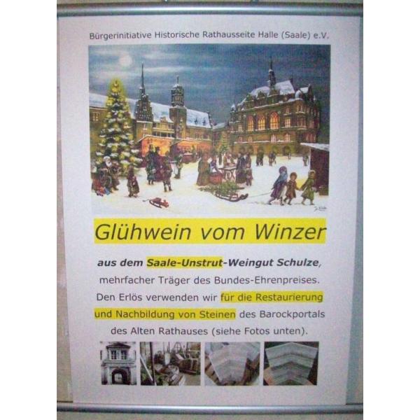 Die Bürgerinitiative Rathausseite e.V. ist auch auf dem diesjährigen Weihnachtsmarkt mit einem Info- und Verkaufsstand vertreten. Interessenten finden uns vom 22. bis 24 November und vom 19. bis zum 23. Dezember in der Partnerstädte-Hütte am Roten Turm neben dem Roland. Nach einem "Probelauf" im vergangenen Jahr werden wir Winzer-Glühwein vom Saale-Unstrut-Weingut Schulze ausschenken.
