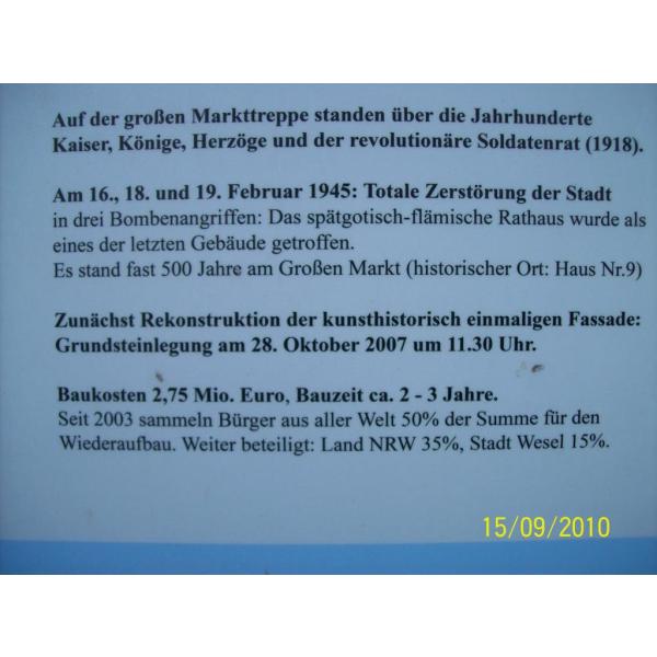 Die Rekonstruktion der eindrucksvollen Fassade des historischen Weseler Rathauses vor einem Nachkriegsbau auf dem Rathaus-Grundstück ist etwa zur Hälfte abgeschlossen. Bereits 1476 wurde dem damaligen Rathaus eine Fassade im flämisch-spätgotischen Stil vorgebaut. Foto: Informationstafel an der Baustelle