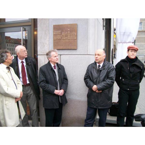Die Gedenktafel für die Ratswaage und für das ehemalige Universitätshauptgebäude wurde heute am Markt 24 (Kaufhof) vom Rektor der Universität Halle, Prof. Wulf Diepenbrock (Foto: 2. v. l.), und Bildhauerin Katrin Pannicke (1. v. r.) enthüllt. Der Rektor und der Kustos der Universität, Dr. Ralf-Torsten Speler (1. v. l.), würdigten die herausragende Rolle der Ratswaage für die Universität.