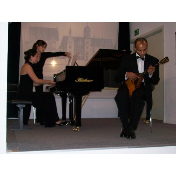Am Sonnabend fand in der Galerie am Domplatz ein ungewöhnliches Benefizkonzert zugunsten des Alten Rathauses statt. Ungewöhnlich war die Instrumentierung: Es spielte am Klavier Elena Mumber und auf der Balalaika Madin Adeniyi Ogunlade - vor dem Hintergrund wechselnder Ansichten der Rathausseite (Markt-Ostseite). Ungewöhnlich ist wohl auch, dass beide Musiker spontan zustimmten, unentgeltlich in Halle (Saale) aufzutreten.