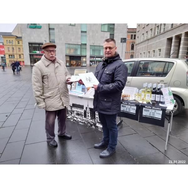Am Sonnabend, dem 5. Februar 2022, bauen wir unseren Info- und Verkaufsstand wieder an der Einmündung der Leipziger Straße in den Marktplatz auf (am ehemaligen Standort des Barockflügels des Alten Rathauses gegenüber dem Kaufhaus New Yorker). Interessenten finden uns dort zwischen 12 und 17 Uhr.