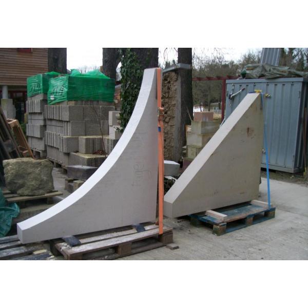Die Sandstein-Rohlinge für die beiden Bogenzwickel des Barockflügel-Portals (Steine Nr. 62 & 64) sind angekommen. Bogenzwickel sind die Flächen zwischen dem Rundbogen und ihrer rechtwinkligen Umrahmung. Die Krümmung ist beim linken schon bearbeiteten Stein bereits zu sehen. In die Flächen arbeitet Bildhauer Ch. Reichenbach die floralen Reliefs ein.