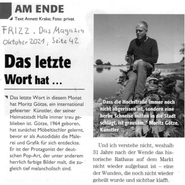 Halles international renommierter Pop-Art-Künstler Moritz Götze beklagt im Oktober-Heft des Magazins FRIZZ u. a., dass "31 Jahre nach der Wende das historische Rathaus auf dem Markt nicht wieder aufgebaut ist - eine der Wunden, die noch nicht wieder geheilt wurde und sichtbar klafft." (Seite 42)