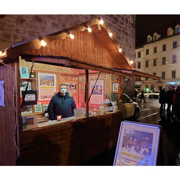 Vorbehaltlich der weiteren Corona-Entwicklung dürfen wir die Vereinshütte neben dem Roland am Montag, dem 6.12., Dienstag, dem 14.12., und am Freitag/Samstag, dem 17./18.12.2021 belegen. Dort gibt es u.a. roten und weißen Saale-Unstrut-Winzerglühwein und den Kleinen Halle-Kalender 2022 der halleschen Künstlerin Sabine Schulz. [zuletzt aktualisiert am 15.12.2021]