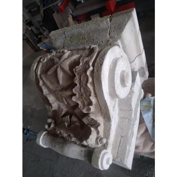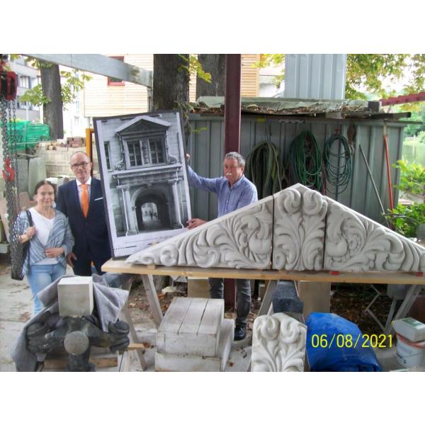 Die Corona-Pandemie erschwert auch unsere Arbeit. Dennoch geht die Restaurierung und Nachbildung der Steine des Barockflügel-Portals weiter. Eines der kompliziertesten Bauteile ist der Schluss- oder Scheitelstein. Dieser Keilstein befand sich am höchsten Punkt des Portalbogens - seinem Scheitel. Die Nachbildung erfordert meisterhaftes Können. Vor der Ausführung in Sandstein fertigt die Steinmetzwerkstatt Korger daher zunächst ein Modell an.