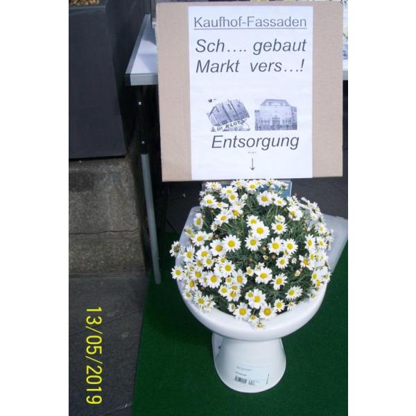 Nachhaltigkeit des Bauens wird immer mehr thematisiert. Der Kaufhof-Erweiterungsbau auf dem Ratswaage-Grundstück, am 13./14. Mai 2004 unter Protest eingeweiht, ist kein Beispiel für Nachhaltigkeit. Seit Anbeginn wegen seiner Blockhaftigkeit, die einem Hochbunker ähnelt, von Einheimischen und Besuchern der Händelstadt beklagt, fällt es schwer, d i e s e n Fassaden Langlebigkeit zu wünschen.