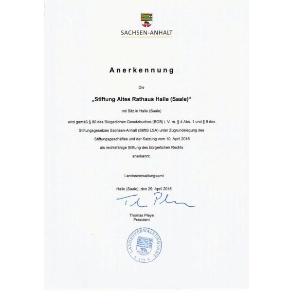 Die Stiftung Altes Rathaus Halle (Saale) hat die erste Zuwendung erhalten. Eine Privatperson, die das Geschehen in der Händelstadt aufmerksam verfolgt und zur Verschönerung des Marktplatzes beitragen möchte, überwies der Stiftung 5.000 Euro. Der Stifter ist gebürtiger Hallenser, der über drei Jahrzehnte seinen Hauptwohnsitz in Halle hatte. Er entschied sich nicht für eine Steinspende, sondern für eine Zustiftung, um den Kapitalstock der Stiftung zu vergrößern.
