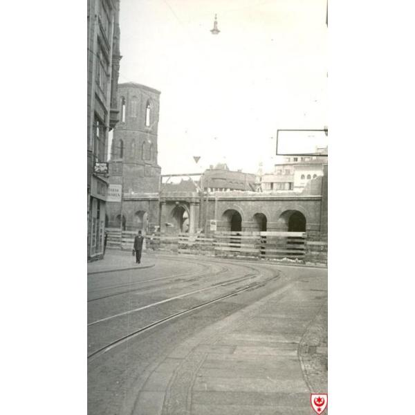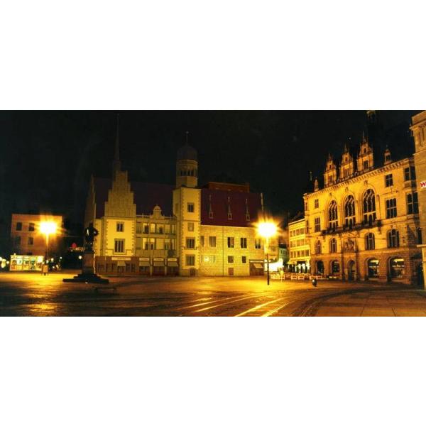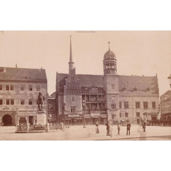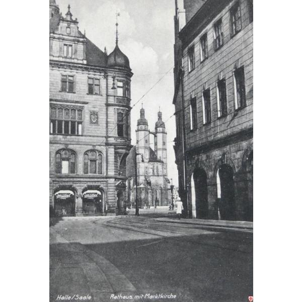 Radio Corax sendet am Sonntag, dem 22.2.2015, zwischen 17.00 und 17.30 Uhr in der Reihe "Phoenix" ein Interview zur Rathausseite (Ostseite) des halleschen Marktplatzes. Foto: Blick aus der Leipziger Straße zum Marktplatz mit Stadthaus (links), Marktkirche und westlichem Teil des Barockflügels des Alten Rathauses (rechts). Quelle: Postkartensammlung der Marienbibliothek