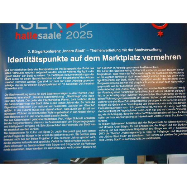 Das Netzwerk Stadtforen publiziert online das Baukultur-Magazin BAUSTEIN. Die jüngste Ausgabe (2/2013) enthält zwei Beiträge über die Händelstadt. Der erste widmet sich der Rathausseite (Ostseite) des halleschen Marktplatzes (Seiten 62 ff.), den Sie nachfolgend unter M e d i e n nachlesen können. Der zweite Beitrag befasst sich mit der Erhaltung markanter hallescher Bauten aus der DDR-Zeit (S. 68-69).
