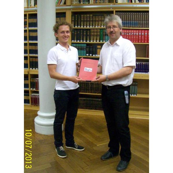 Herr Jan Kittl, tschechischer Absolvent der Technischen Universität Dresden, übergab heute ein Exemplar seiner Masterarbeit an den Stadtarchivar, Herrn Ralf Jacob (s. Foto). Die Untersuchung befasst sich auch mit der halleschen Zeitgeschichte. Der Autor vergleicht die Bestrebungen zum Wiederaufbau der Alten Rathäuser in Halle und in Prag. Siehe u.a. auch die Nachricht vom 4.7.2013. Die Arbeit kann bei uns ausgeliehen werden.