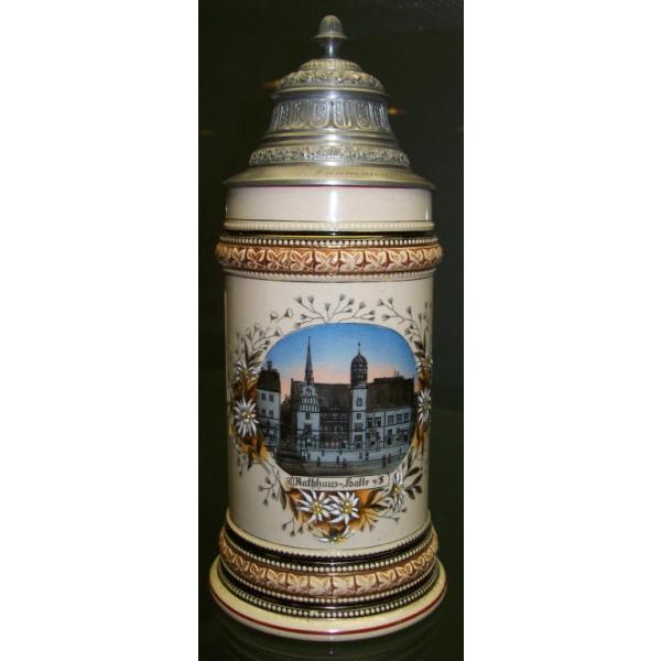 Der nächste Infostand wird am Sonnabend, dem 23. Februar 2013, von 13 bis 18 Uhr am Ratshof (Einmündung Leipziger Straße) betreut. Interessenten können sich u.a. bei einem Kräuterlikör "Altes Rathaus" aufwärmen und ein Stifterbrief-Muster ansehen. - Foto: Bierseidel mit dem Motiv "Altes Rathaus", 2012 ausgestellt im Technischen Halloren- und Salinemuseum