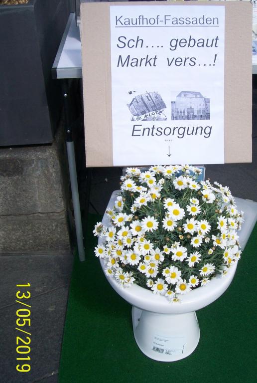 Nachhaltigkeit des Bauens wird immer mehr thematisiert. Der Kaufhof-Erweiterungsbau auf dem Ratswaage-Grundstück, am 13./14. Mai 2004 unter Protest eingeweiht, ist kein Beispiel für Nachhaltigkeit. Seit Anbeginn wegen seiner Blockhaftigkeit, die einem Hochbunker ähnelt, von Einheimischen und Besuchern der Händelstadt beklagt, fällt es schwer, d i e s e n Fassaden Langlebigkeit zu wünschen.