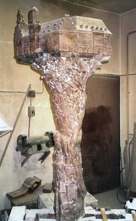 Wäre die Bronzeplastik des Alten Rathauses eine Person, würde sie heute "erwachsen". Das nun "volljährige" Kunstwerk, allein durch Spenden finanziert, vom KAR e.V. in Auftrag gegeben und von Burg-Absolventin Cathleen Meier gestaltet, wurde am 28.10.2001 feierlich eingeweiht. - Das Foto zeigt die Plastik noch in der Magdeburger Gießerei.
