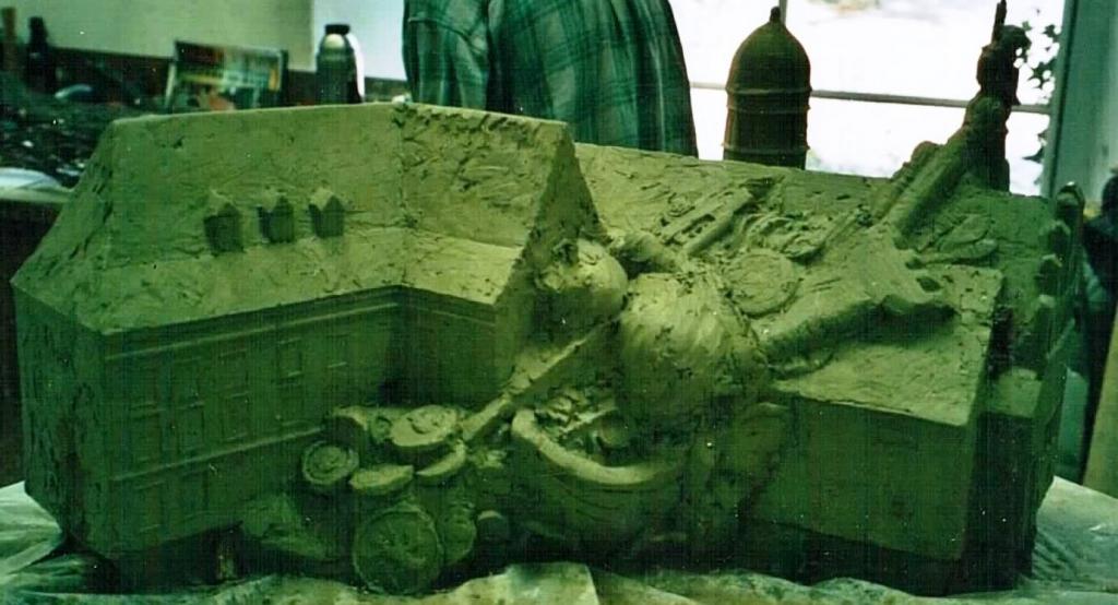 Ehe das Alte Rathaus in Bronze gegossen wurde, hatte die Künstlerin im Atelier der Burg Giebichenstein ein Tonmodell angefertigt. Das Foto zeigt die Rückseite des in Arbeit befindlichen "Kopfes" mit künstlerischen "Zutaten". Nun fehlt noch das Barockflügel-Portal des Alten Rathauses - das dann dritte Denkmal auf dem Marktplatz, welches dem Engagement von Bürgern zu verdanken ist.