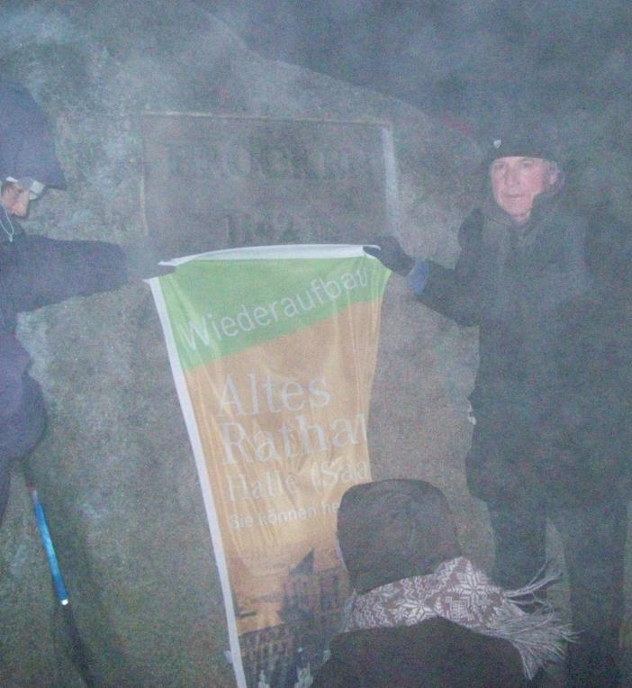 Den Besuchern dieser Seiten wünschen wir alles Gute für 2013. Mitglieder und Sympathisanten der BI Rathausseite e.V. begrüßten das neue Jahr auf dem böigen Gipfel des Brockens - und hielten sich durch diesen nächtlichen Aufstieg fit für die Anforderungen der kommenden Monate. - Foto: Die Fahne der Bürgerinitiative Rathausseite e.V., die sonst an den Infoständen in Halle weht, wenige Minuten nach Mitternacht am Gipfelstein des höchsten Berges im Harz