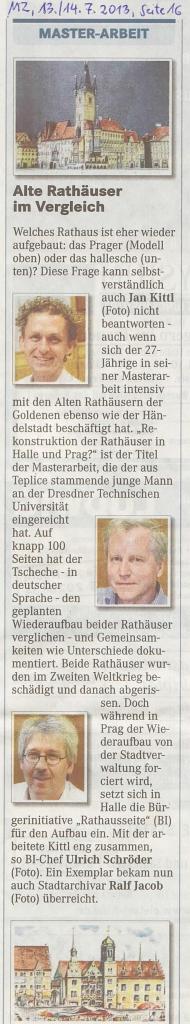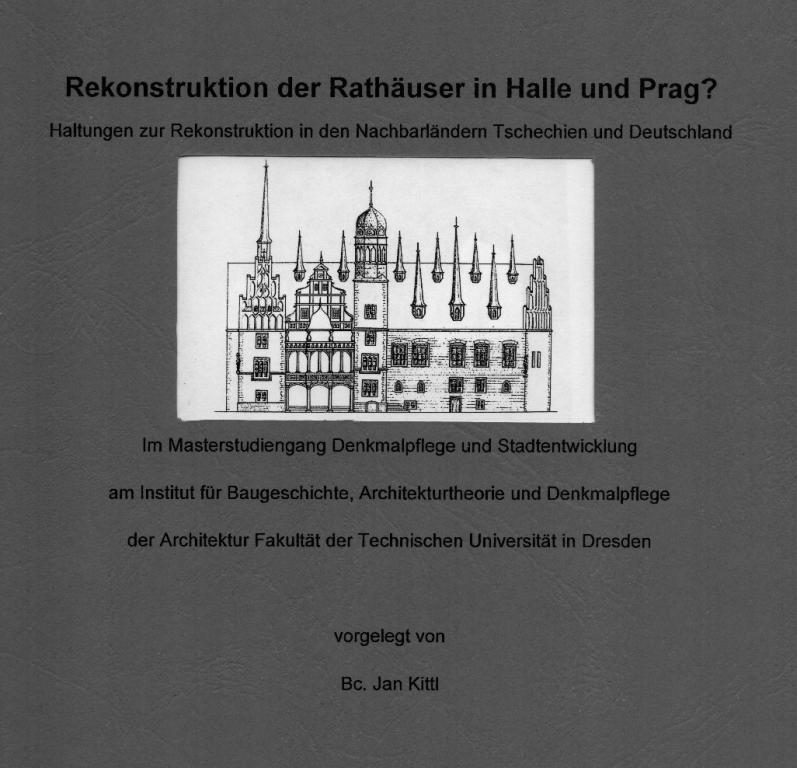 "Rekonstruktion der Rathäuser in Halle und Prag? Haltungen zur Rekonstruktion in den Nachbarländern Tschechien und Deutschland". Masterarbeit von Jan Kittl (CZ), am Institut für Baugeschichte, Architekturtheorie und Denkmalpflege der Architektur-Fakultät der TU Dresden. Die Mitteldeusche Zeitung berichtete darüber: -> Medien