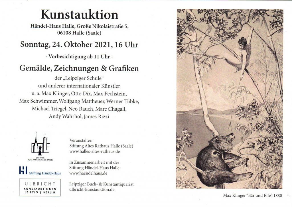 Die Werke, z.B. von Marc Chagall, Moritz Götze, Max Klinger oder Pablo Picasso, können ab 11 Uhr im Kammermusiksaal des Händel-Hauses besichtigt werden. Auktionator Dr. M. Ulbricht beginnt 16 Uhr mit der Versteigerung. Weitere Informationen zu den einzelnen Kunstwerken (Mindestgebote usw.) werden am 14.10.2021 hier unter "Aktuelles" veröffentlicht.