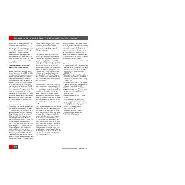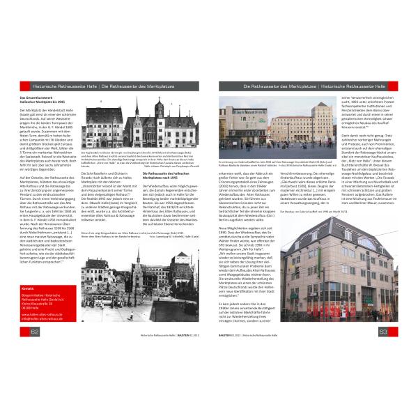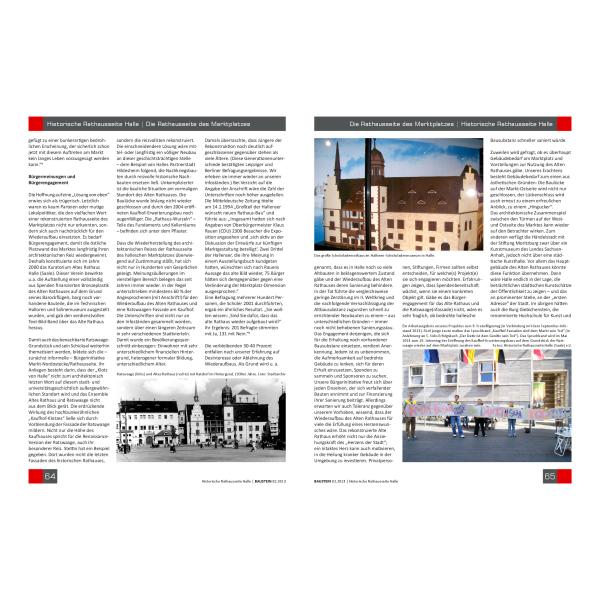 Das Netzwerk Stadtforen publiziert online das Baukultur-Magazin BAUSTEIN. Die jüngste Ausgabe (2/2013) enthält zwei Beiträge über die Händelstadt. Der erste widmet sich der Rathausseite (Ostseite) des halleschen Marktplatzes (Seiten 62 ff.), den Sie nachfolgend unter M e d i e n nachlesen können. Der zweite Beitrag befasst sich mit der Erhaltung markanter hallescher Bauten aus der DDR-Zeit (S. 68-69).