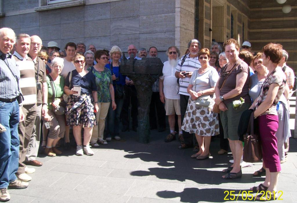 Heute besuchte eine Reisegruppe aus dem belgischen Halle die Händelstadt. Die Touristen ließen sich auf dem Marktplatz auch ausführlich über den einstigen architektonischen Reiz seiner Ostseite informieren und spendeten für den Wiederaufbau des Alten Rathauses. Dank dessen können wir 517,80 EUR auf das Spendenkonto einzahlen. - Foto: Die belgischen Hallenser an der Bronzeplastik des Alten Rathauses