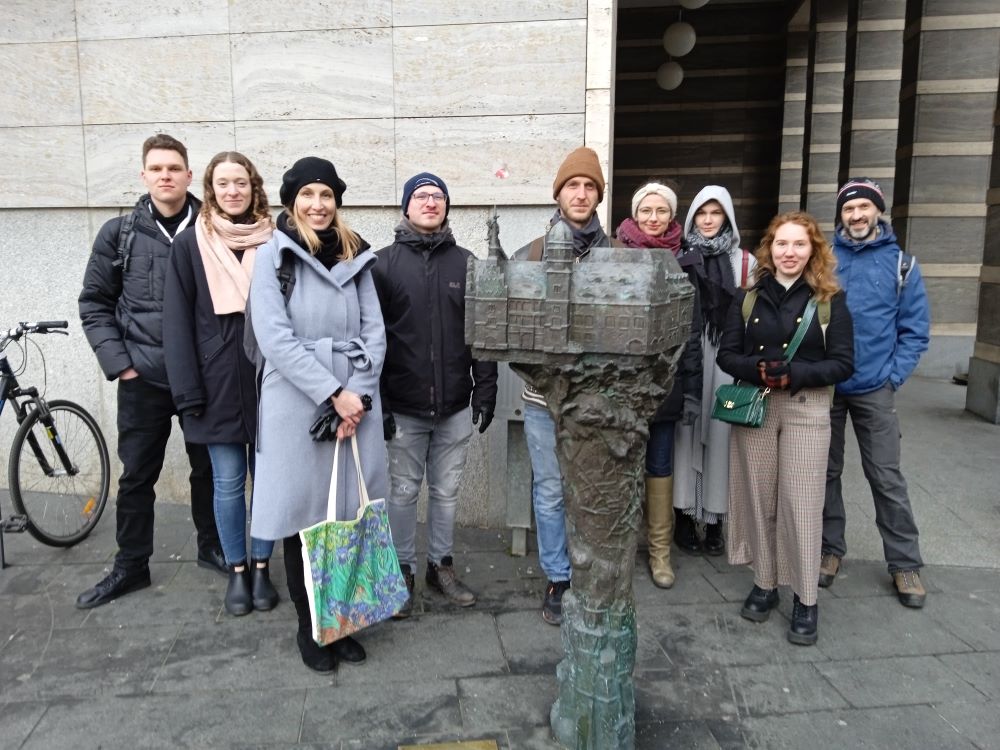 Diesem Anliegen sind wir gern nachgekommen: Im würdigen Löwengebäude informierten sich die Masterstudenten zunächst anhand von Illustrationen über die Marktplatzgestaltung in Vergangenheit und Gegenwart. Anschließend wurde vor Ort die bauliche Situation erläutert: die derzeitige Baulücke am ehemaligen Standort des Alten Rathauses, das Ratswaagegrundstück mit dem leerstehenden Kaufhausklotz darauf, das Areal des Barockflügels. Auch der von der Stadtverwaltung für das Barockflügel-Portal gewünschte Interimsstandort in der Gustav-Anlauf-Straße ist aufgesucht worden. Die angehenden Denkmalpfleger reagierten mit Unverständnis auf diesen Standort und plädierten für die Portalerrichtung an der Stelle, wo es bis 1950 stand. Ein Gruppenfoto an der Bronzeplastik des Alten Rathauses schloß den Besuch ab. (Foto: BI)