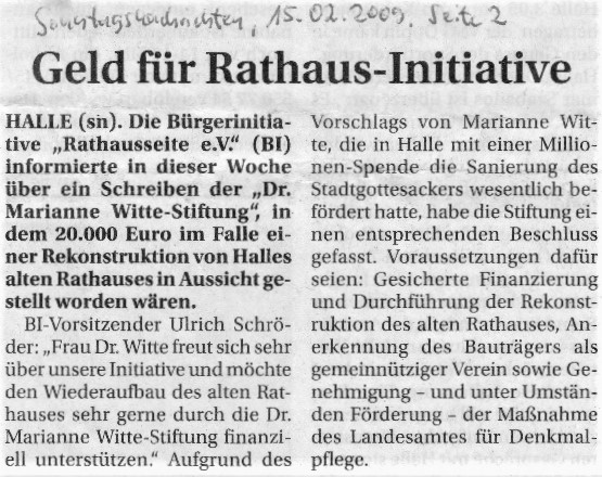 Die Dr. Marianne Witte-Stiftung möchte den Wiederaufbau des Alten Rathauses finanziell unterstützen, wenn bestimmte Voraussetzungen erfüllt sind. Mehrere Zeitungen berichteten. Die Meldung der Sonntagsnachrichten vom 15.2.2009 finden Sie unter -> Medien.
