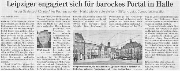 Von Bernd Lähne erschien am 16.1.2020 in der Online-Ausgabe der "Dresdner Neuesten Nachrichten" ein Beitrag über das barocke Portal des 1950 abgetragenen nahezu unzerstörten Südflügels von Halles Altem Rathaus.