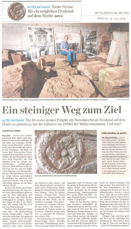 "Ein steiniger Weg zum Ziel" - unter diesem Titel veröffentlichte Detlef Färber in der "Mitteldeutschen Zeitung" vom 16. Juli 2018 (Seite 10) seinen Beitrag über die Fortschritte bei der Restaurierung und Nachbildung von Steinen des Barockflügel-Portals des Alten Rathauses. Etwa ein Drittel der ca. 90 Portalsteine haben inzwischen einen "Steinpaten" gefunden. Ab einem Nettopreis von 150 Euro kann man schon "Pate" werden.