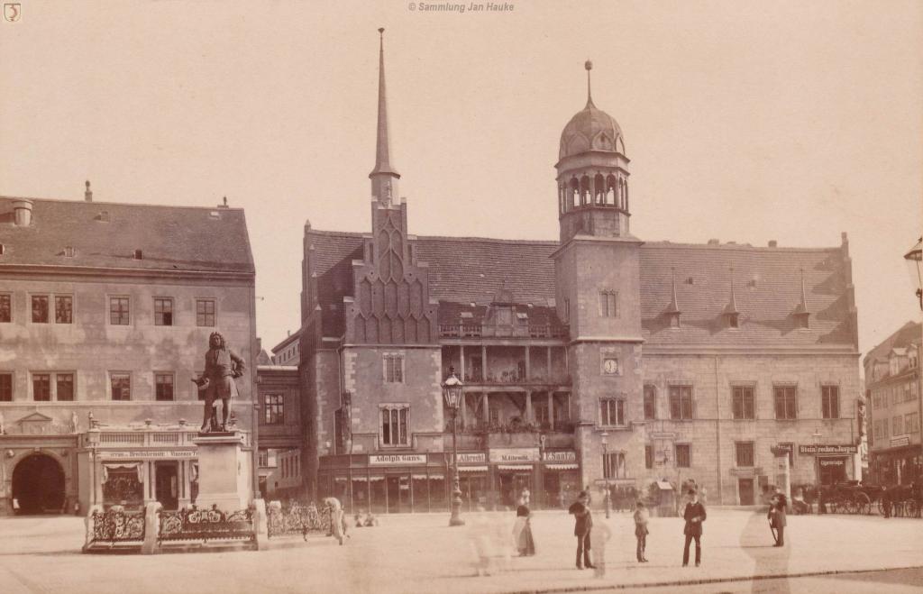 Abbildung: Ansicht des Alten Rathauses, der Ratswaage und des Händeldenkmals, Verlag Sophus Williams, 1890. Sammlung J. Hauke