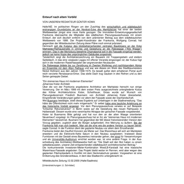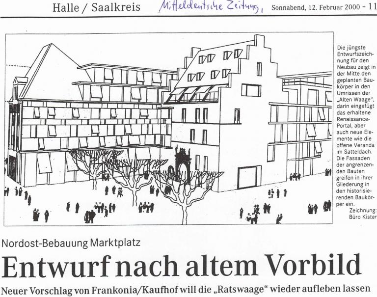Nordost-Bebauung Marktplatz Neuer Vorschlag von Frankonia / Kaufhof will die "Ratswaage" wieder aufleben lassen Von Günter Kowa Mitteldeutsche Zeitung, 12. Februar 2000, Seite 11