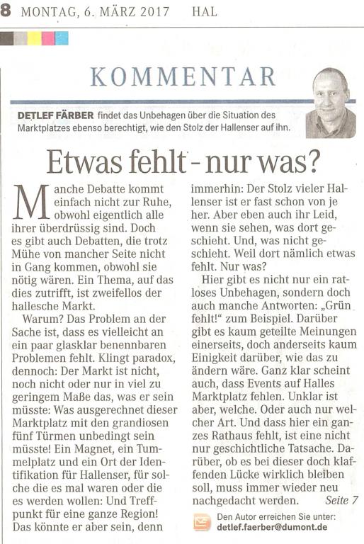 Kommentar von Detlef Färber zum halleschen Marktplatz in der Mitteldeutschen Zeitung am 6. März 2017, Seite 8. Der Kommentator bezog sich auf seinen Artikel "Drehen bis es leuchtet" auf der vorangehenden Seite. Die Online-Version des Artikels, veröffentlicht am 7. März unter dem Titel "Marktplatz Halle - Was fehlt, damit der Platz richtig brummt" ...