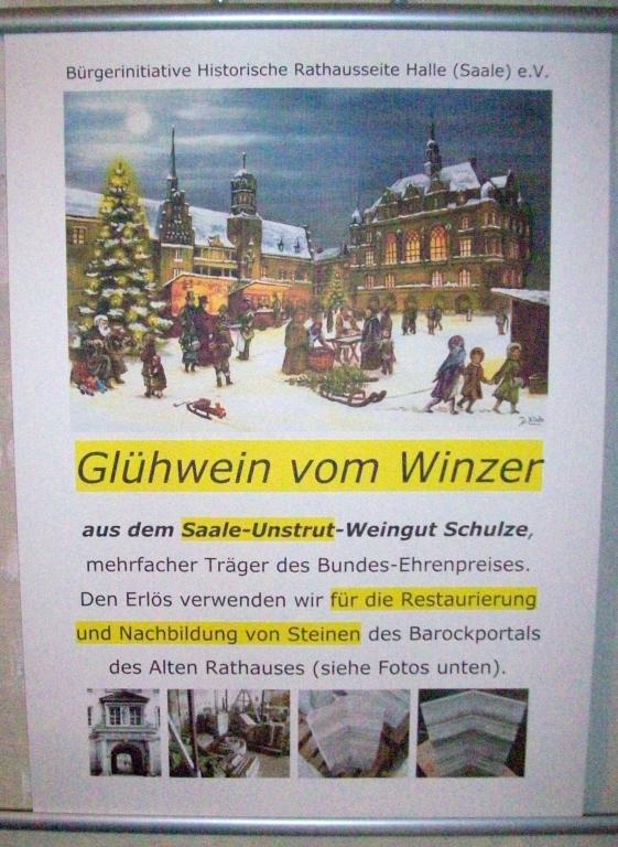 Die Bürgerinitiative Rathausseite e.V. ist auch auf dem diesjährigen Weihnachtsmarkt mit einem Info- und Verkaufsstand vertreten. Interessenten finden uns vom 22. bis 24 November und vom 19. bis zum 23. Dezember in der Partnerstädte-Hütte am Roten Turm neben dem Roland. Nach einem "Probelauf" im vergangenen Jahr werden wir Winzer-Glühwein vom Saale-Unstrut-Weingut Schulze ausschenken.