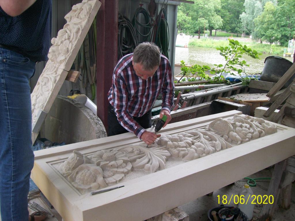 Zunächst hatte der Bildhauer anhand von Fotos das Relief aus Ton modelliert. Nach Abnahme durch Auftraggeber und Denkmalpfleger wurde ein Gipsmodell angefertigt (links im Foto). Dieses war die Grundlage für die Übertragung in Sandstein.