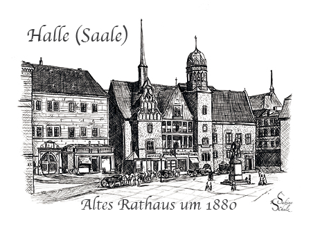 Die in Halle lebende Künstlerin Sabine Schulz ist vielen durch ihre Tusche-Grafiken bekannt. Ihre Motive aus der Händelstadt sind z. T. auch als Kalender erhältlich. Wir freuen uns, dass Frau Schulz Halles Altes Rathaus in der Version um 1880 in ihr Repertoire aufgenommen hat. Dieses Motiv wird an unseren Infoständen als Magnet und als Poster erhältlich sein.