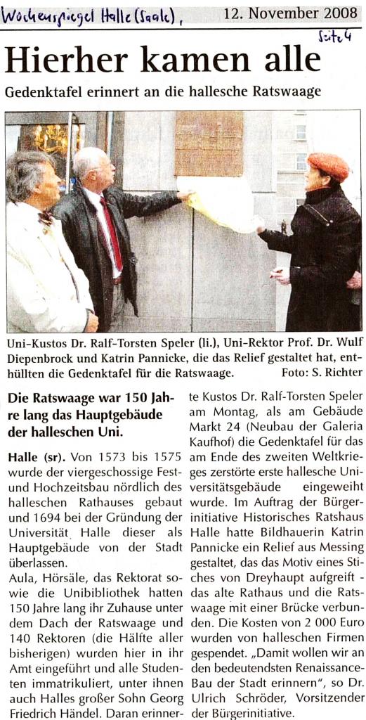 Gedenktafel erinnert an die hallesche Ratswaage. Wochenspiegel Halle (Saale), 12. November 2008, Seite 4.