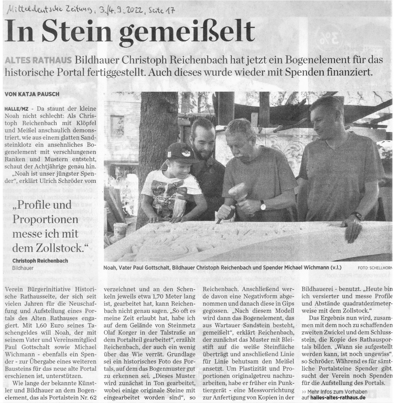 ALTES RATHAUS. Bildhauer Christoph Reichenbach hat jetzt ein Bogenelement für das historische Portal fertiggestellt. Auch dieses wurde wieder mit Spenden finanziert - Von Katja Pausch, Mitteldeutsche Zeitung, Ausgabe für Halle (Saale), 3./4. September 2022, Seite 17; MZ online am 2. September 2022