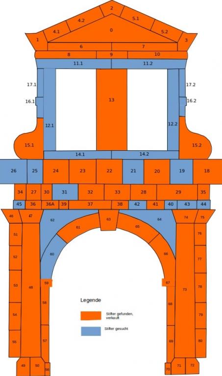 Inzwischen sind nur noch 21 der 90 Portalsteine verfügbar. Die Abbildung zeigt den Stand der Steinpatenschaften bis zum 3. Juni 2019: rötlich = vergeben, blau = noch frei. Maße und Bruttopreise (d.h. inklusive 19 % Mehrwertsteuer) der noch verfügbaren Portalsteine des Barockflügel-Portals enthält das neue Infoblatt 2019-06. Inzwischen haben sich Steinpaten auch für die Steine Nr. 31 und 60 gemeldet. [aktualisiert am 18.6.2019]