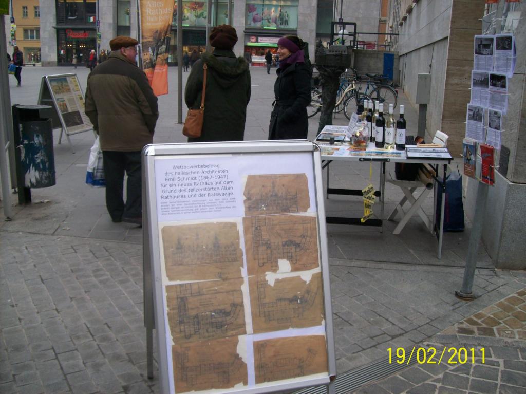 Zum nächsten Infostand laden wir Interessenten für Sonnabend, den 12. März 2011, ein. Er wird von 13 Uhr bis 18.30 Uhr am Ratshof betreut. Begleitend führen wir wieder eine kleine Tombola durch, bei der jedes Los gewinnt und der Erlös das Spendenkonto für das Alte Rathaus füllt. Vorstandsmitglieder der BI Rathausseite e.V. übergaben heute die Zeichnungen Emil Schmidts zu einem neuen Rathaus an den Leiter des halleschen Stadtarchivs, Herrn Jacob (siehe Eintragung vom 1.2.2011).
