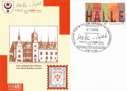 Abbildung: 1200 Jahre Halle - Sonderstempel auf Karte mit Altem Rathaus (Sammlung M. Woudenberg)