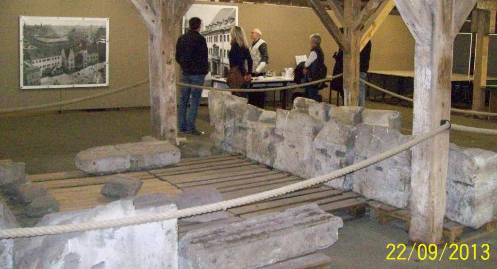 Foto: Im Vordergrund geborgene Teile des Barockflügel-Portals des Alten Rathauses im Salinemuseum, im Hintergrund der gemeinsame Stand des KAR und der BI beim Salzfest 2013