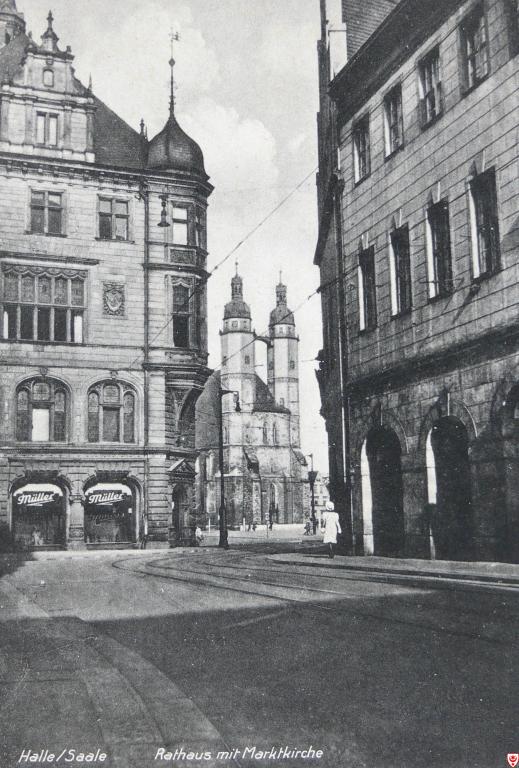 Radio Corax sendet am Sonntag, dem 22.2.2015, zwischen 17.00 und 17.30 Uhr in der Reihe "Phoenix" ein Interview zur Rathausseite (Ostseite) des halleschen Marktplatzes. Foto: Blick aus der Leipziger Straße zum Marktplatz mit Stadthaus (links), Marktkirche und westlichem Teil des Barockflügels des Alten Rathauses (rechts). Quelle: Postkartensammlung der Marienbibliothek