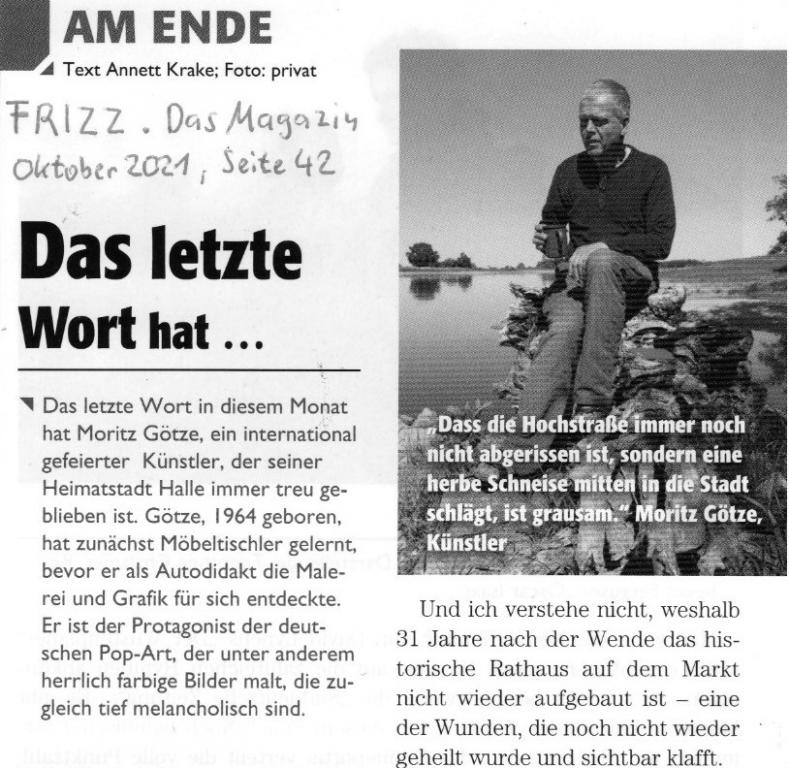 Halles international renommierter Pop-Art-Künstler Moritz Götze beklagt im Oktober-Heft des Magazins FRIZZ u. a., dass "31 Jahre nach der Wende das historische Rathaus auf dem Markt nicht wieder aufgebaut ist - eine der Wunden, die noch nicht wieder geheilt wurde und sichtbar klafft." (Seite 42)