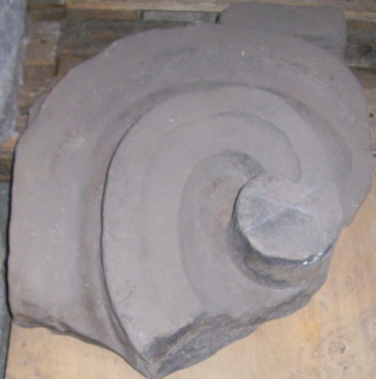 Noch vorhandene Teile des Barockflügel-Portals des Alten Rathauses können wieder zur Museumsnacht am 4. Mai 2013 (ab 18 Uhr) im Halloren- und Salinemuseum besichtigt werden. Das Portal zierte einst den Südflügel des Alten Rathauses. Schreiben Sie uns bitte, wenn Sie zur Rekonstruktion des Portals beitragen möchten. - Foto: Volute des Barockflügel-Portals, gelagert im Salinemuseum
