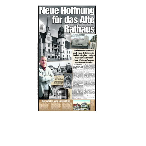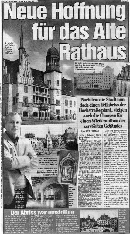 Bekommt Halle bald wieder ein richtiges Rathaus? - BILD Halle, 18.11.2009, Seite 3 Die im BILD-Artikel erwähnte Diskussion über die Wiedererrichtung des Alten Rathauses bei "Radio Corax" am 18. November 2009 mit dem Vertreter des AKI e.V. sowie Stadtrat der Partei B90/Die Grünen, Christian Feigl, und dem stellv. Vorsitzenden der BI Rathausseite e.V., Prof. Dr. Helmut Göhre, können Sie ...