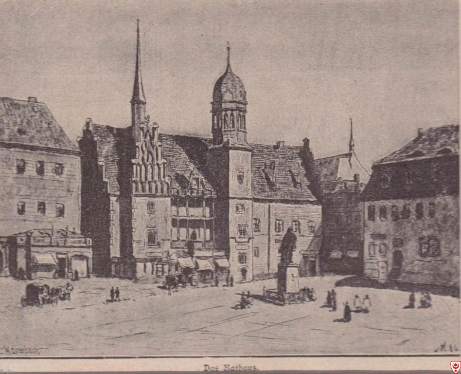 Abbildung: Halles Altes Rathaus, Zinkographie 1886 aus der Sammlung J. Hauke