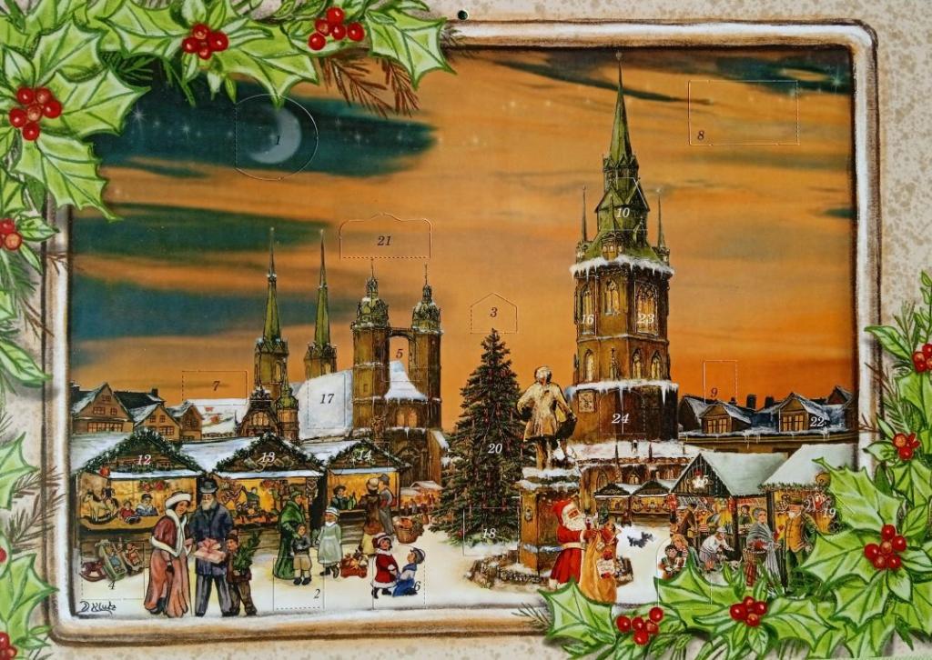 Momentan sind nur noch etwa 20 Adventskalender mit dem Motiv "Altes Rathaus und Stadthaus" verfügbar. Wegen der Kostensteigerung ist ein Nachdruck unbestimmt. Von unserem Lieferanten haben wir jedoch neue "kalorienfreie" Kalender erhalten: 5 Türme und Händel-Denkmal, gemalt von D. Klutz (siehe Abb.).