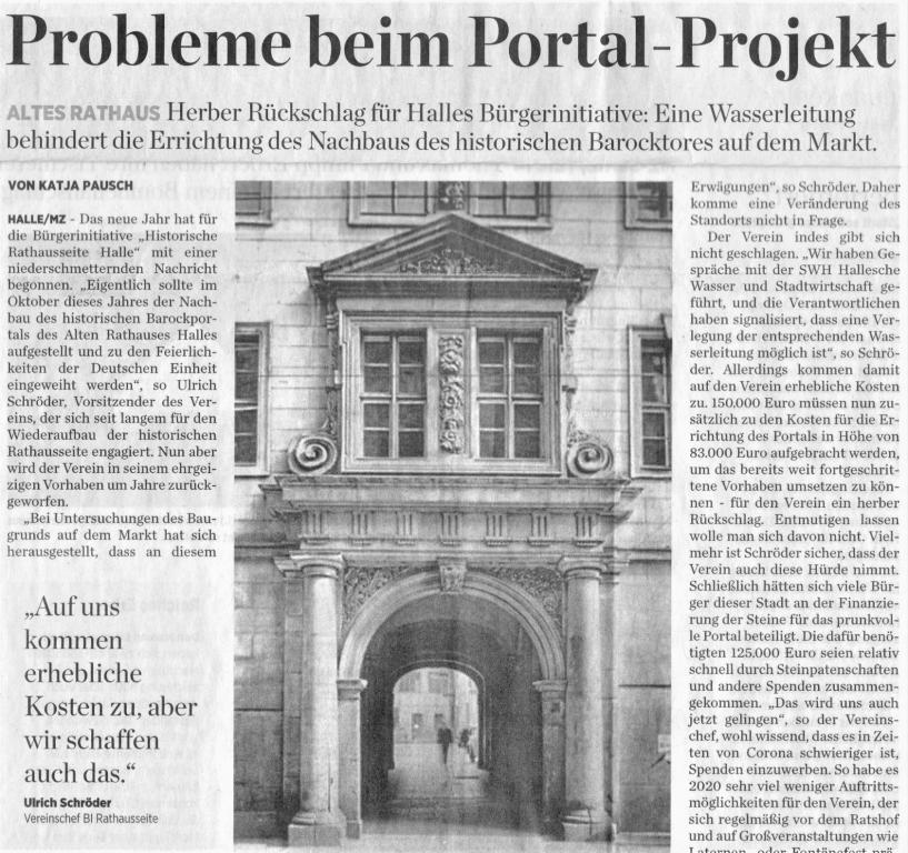 In der Mitteldeutschen Zeitung vom 18.1.2021 berichtet Katja Pausch auf Seite 11 (Lokalteil für Halle und den Saalekreis) sehr ausführlich über "Probleme beim Portal-Projekt". "Herber Rückschlag für Halles Bürgerinitiative: Eine Wasserleitung behindert die Errichtung des Nachbaus des historischen Barocktores auf dem Markt".