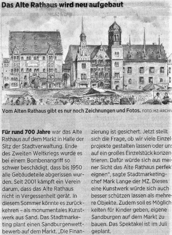 Das Stadtmarketing Halle (Saale) beabsichtigt, eine Sandskulptur von Halles Altem Rathaus anfertigen zu lassen. Im Sommer d. J. soll das Kunstwerk auf dem Marktplatz stehen. Unser Verein freut sich darüber. Die Mitteldeutsche Zeitung überschrieb das Projekt mit "Das Alte Rathaus wird neu aufgebaut" und illustrierte die Meldung mit einem Sommerbild des leider 2020 verstorbenen halleschen Malers Klaus Rebsch.