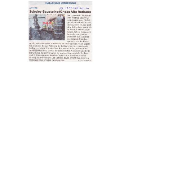 AKTION Schoko-Bausteine für das Alte Rathaus Halloren Schokoladenfabrik unterstützt erneut die BI Rathausseite e.V. Mitteldeutsche Zeitung, 17. Oktober 2011, Seite 10